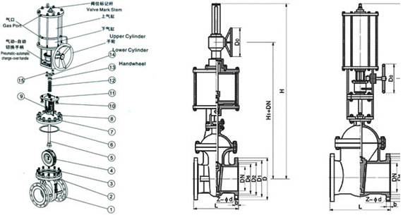①本閥主要由閥體、閥蓋、閘板、閥桿、密封圈、雙層氣缸及其活塞、活塞桿、隔板連同緩沖機構(gòu)、手動機構(gòu)、氣動-手動轉(zhuǎn)換裝置和閥蓋填料裝置等部分組成。