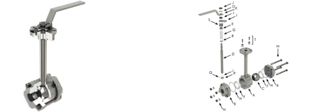 ⑥整體式防脫出閥桿:枚耶低溫閥門(mén)采用整體式閥桿與球嚙合,并采用帶安全定位螺釘?shù)拇舐菁y閥桿套環(huán)將閥桿固定在閥腔中;