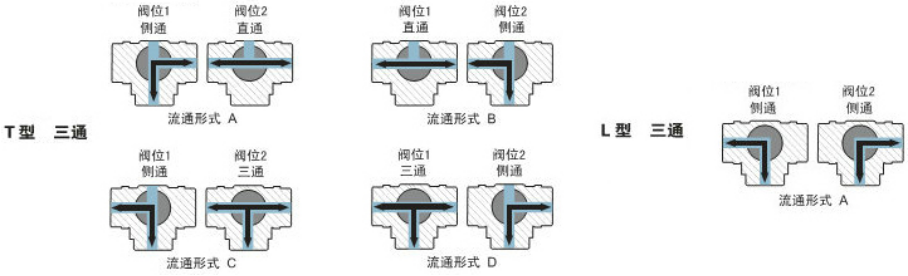 ④T型閥芯孔道可使三條正交的管道互相連通或切換,起分流或合流作用;L型孔道連接相互正交的兩管道。使另一條孔道切斷,起改變介質(zhì)流向作用。